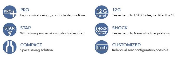 The naming of our seats already includes the most important features. The Nautic PRO for example offerslots of comfort and ergonomic design. The Nautic STAR however features a heavy duty suspension unit Please check the symbol-guide for more information.